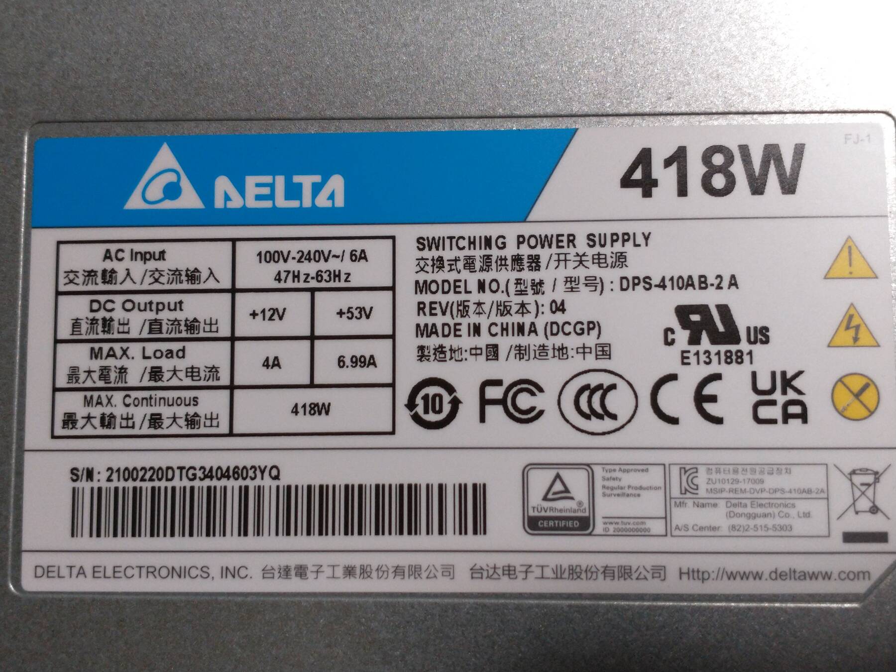 | Power Supply | Delta DPS-410AB-2A 418W +12V4A +53V7A |